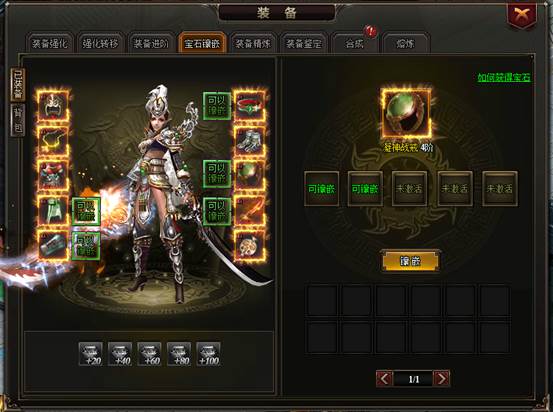 装备还可以通过镶嵌宝石来增强属性,不过需要先给装备开孔哦,装备的强化等级越高,开孔数量越多,所以亲们可以勇敢大胆的强化开孔,已镶嵌的宝石也可以去下。