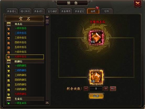 玩家可通过【登天台】获得1级宝石碎片,当有过多的1级宝石,千万不要丢弃了,这些宝石是可以合成高级宝石的喔,玩家可以使用两种方式进行合成,银两合成成功几率较低,元宝合成则是100%成功,合成之后的宝石效果是一样的,屌丝也有机会合成全套闪亮亮的顶级宝石啦!