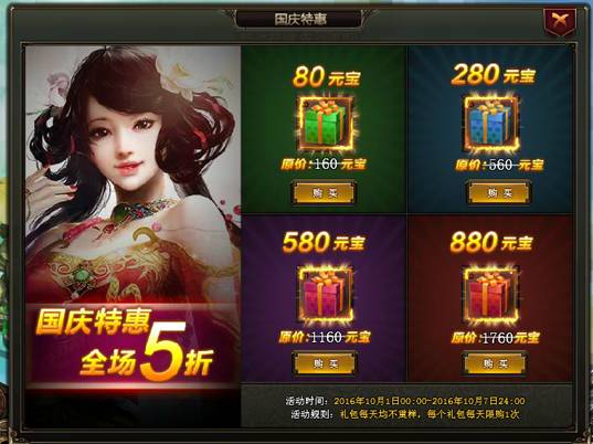 活动时间内每日礼包进行随机更换,每种礼包只能购买一次。