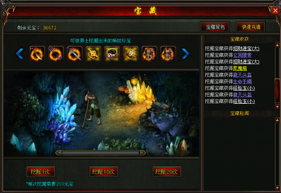烈焰宝藏系统是方便玩家寻觅宝物的系统,在界面右上角“宝藏”图标中,可以挖到各种稀世珍宝,更有宝藏背包方便玩家存储挖到的宝物。