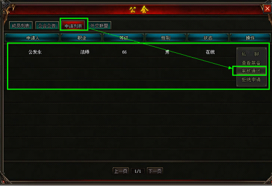 在公会面板中,选择“申请列表”标签,可以查看申请公会的玩家,不过只有公会会长、副会长、长老才有权限审核哦