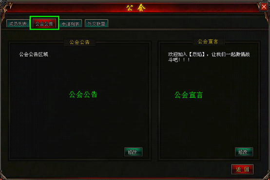 在公会面板中,选择“公会公告”可以进行公会公告和公会宣言设置,公会公告只有公会内部成员可看见,而公会宣言是对外的口号哦