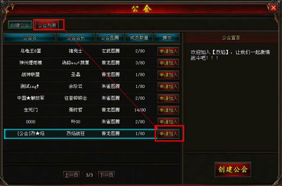 打开公会面板后,选择“公会列表”标签,即可选择一个公会申请加入吧