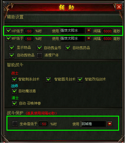 通过快捷键Home打开辅助设置界面,设置了自动回复HP和MP后,别忘了查看背包中是否有足够的药品,和设置药品回复间隔哦,设置之后即可通过快捷键Z开始轻松的挂机战斗了