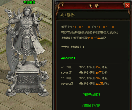 2、 占领皇城的公会会长每日可在烈焰城[城主雕像]领取2000元宝皇城奖励