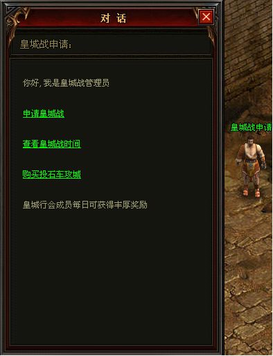 1、 只有公会会长可以在荒漠皇城门口的NPC[皇城战申请]处申请攻城,申请城战需要“攻城令牌”,令牌可以击杀怪物掉落或在商城购买