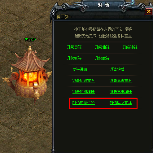 3、 开放【圣】烈焰·神甲男女互换(在沙漠土城NPC“神工炉”处进行男女互换)