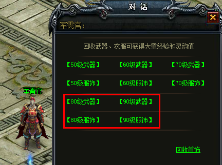 4、 增加80、90级武器、衣服回收(在烈焰城NPC“军需官”处回收可获得大量经验和灵韵值)