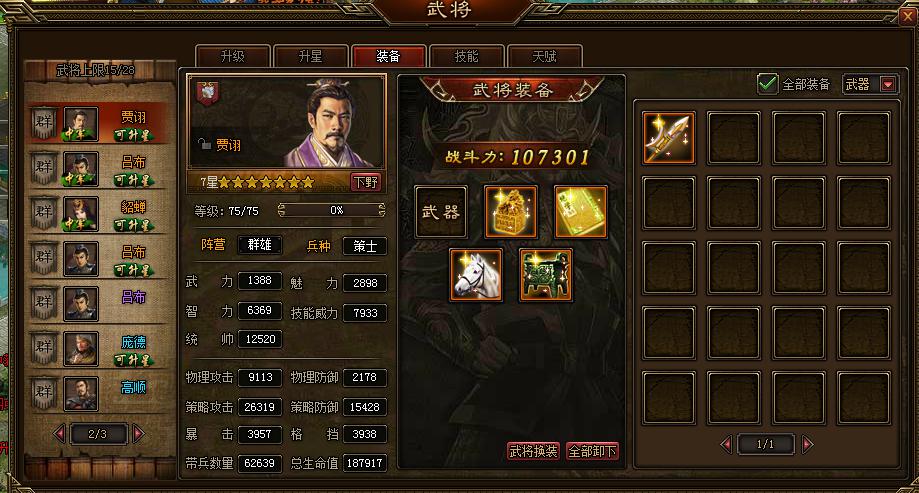 a、武将装备分为武器、兵符、兵书、坐骑、宝物。穿上装备后,武将如虎添翼。
