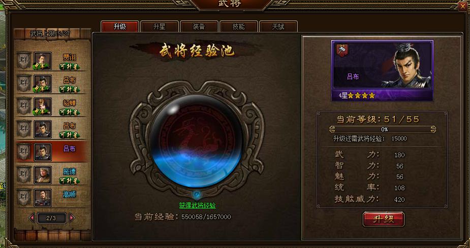 1、升级:点击升级按钮后,系统就会自动从武将经验池里抽取武将经验补充给武将,使武将提升等级。武将提升等级后属性会获得大幅度成长。