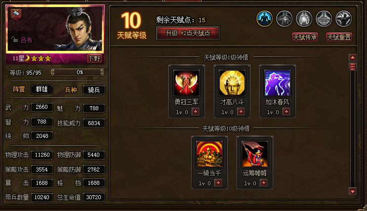 5、天赋:花费银两升级天赋等级后可以获得天赋点。天赋点用于提升天赋技能等级。武将到达10星开放天赋功能。