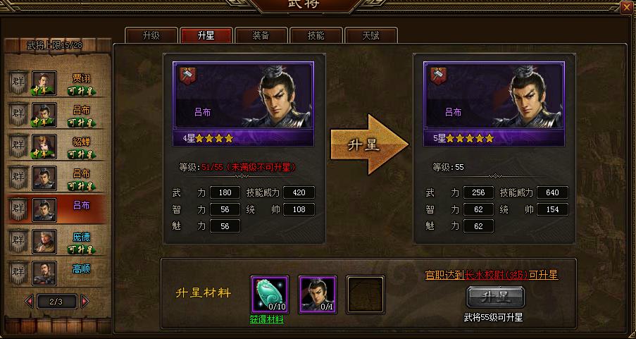 2、升星:武将升到满级后,就必须要对武将进行升星才可以继续升级。