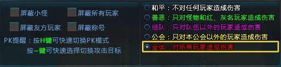 游戏中目前设有和平、善恶、公会、组队、全体 五种战斗模式