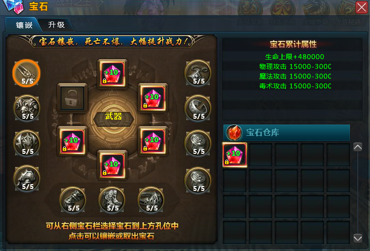 宝石类型:攻击宝石、暴伤宝石、生命宝石、物防宝石、魔防宝石、毒防宝石