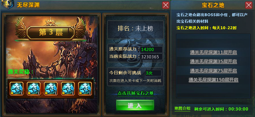 宝石系统:角色战力达到系统推荐战力后可以激活进入无尽深渊