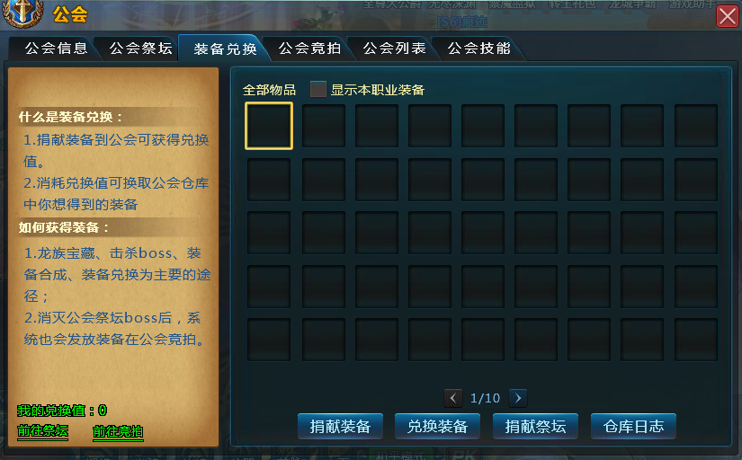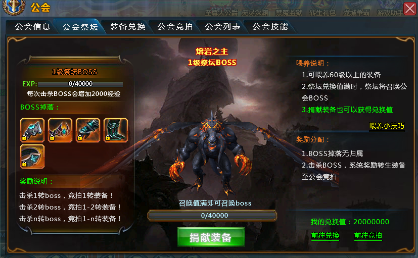公会成员可以通过捐献装备来喂养公会BOSS,当召唤值满就可以召唤BOSS,每天可以召唤20次,喂养的BOSS可以升级,击杀越高级的祭坛BOSS,就有机会获得更高装备的装备!捐献装备可以获得兑换值,喂养的装备直接吞噬不会再存在公会仓库里,所以请各位看清楚喂养的装备哦!