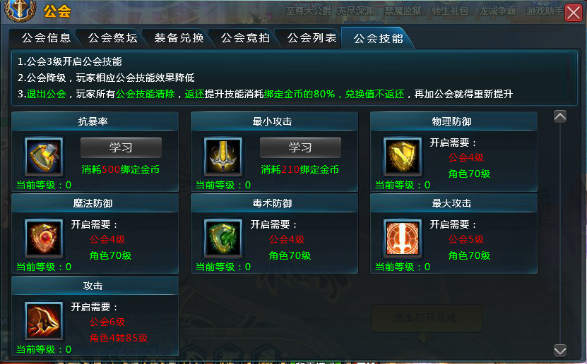 退出公会,玩家所有的公会技能清除,返还提升技能消耗绑定金币的80%,兑换值不返还,再加公会就要重新提升