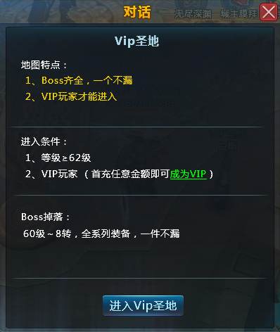 1. VIP专属地图,通过NPC”白斯“进入该地图,只有带有VIP标识的62级以上的玩家才能进入
