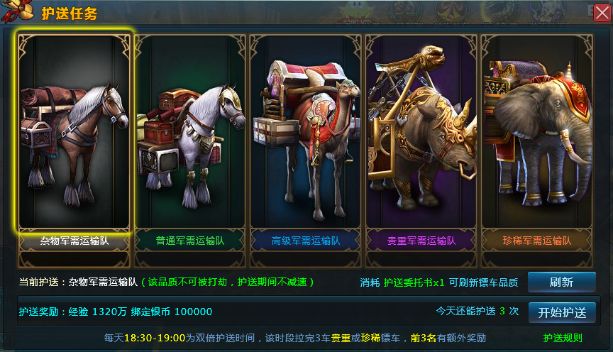 2、 杂物、普通、高级品质的护送不可被打劫,护送期间不减速;贵重、珍稀品质的护送可被玩家打劫,护送期间减速60%