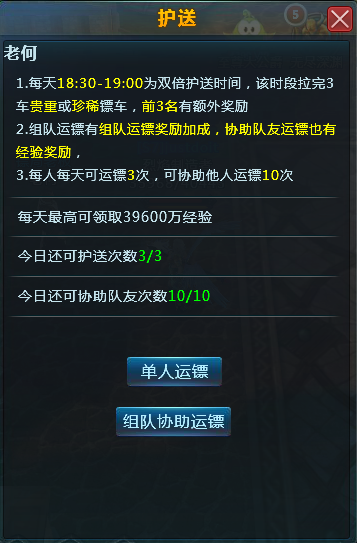 3、 每人每天可运镖3次,可协助他人运镖10次