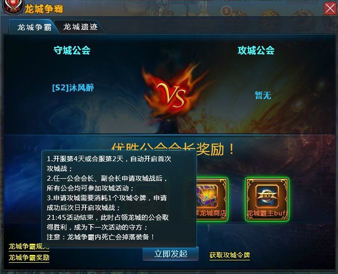 21:00-21:45活动期间占领龙城中间的旗帜并坚守15分钟即可获胜,如活动时间结束后各公会都无法坚守15分钟则龙城主的状态还是虚位以待!
