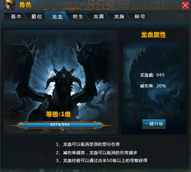 3、 龙血经验可以通过击杀50级以上的怪物获得