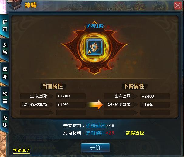 护符:可以通过50级以上的怪物掉落,主要提升人物的生命上限,另外可以通过VIP等级礼包的护符强化石进行治疗药水效果的提升