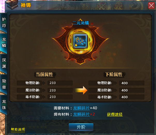 龙鳞:通关龙鳞副本可获得,主要提升人物的各属性防御