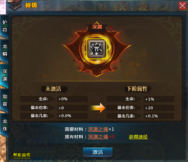 深渊:可在无尽深渊副本(战力达到系统推荐战力后开启)后通关获得,主要提升人物的生命、暴击伤害、暴击几率