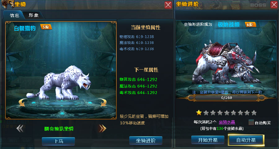 2. 不同的星级或不同阶数的坐骑附加的属性不同,坐骑等级的提高能给人物角色提高大量属性
