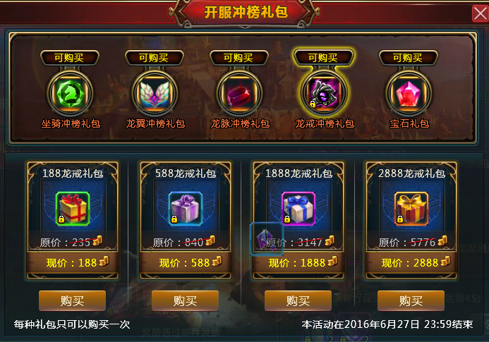 开服前七天,即可购买对应的冲榜礼包,每个礼包仅可购买一次哦!