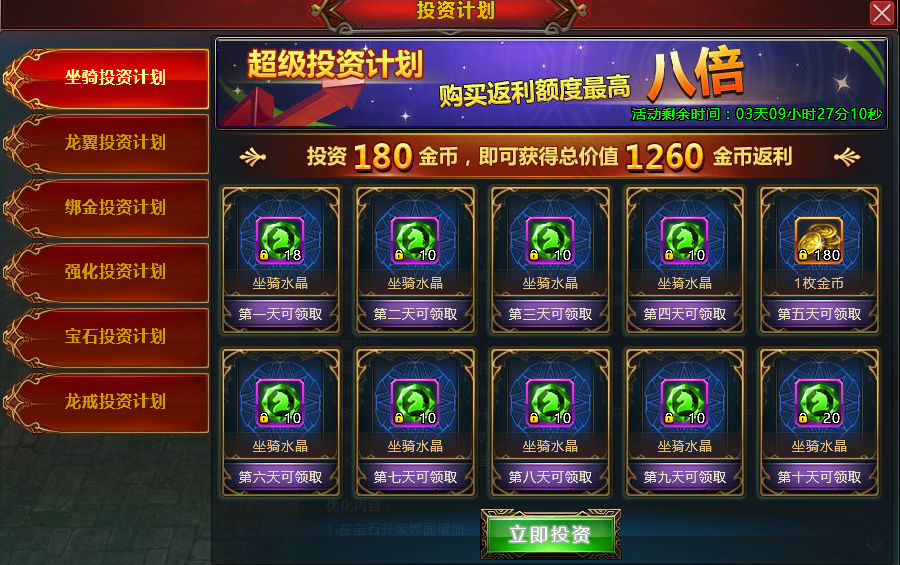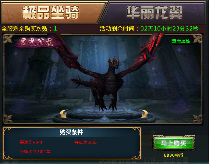 活动期间,全服共有3只坐骑与翅膀可进行抢购,唯一产出途径