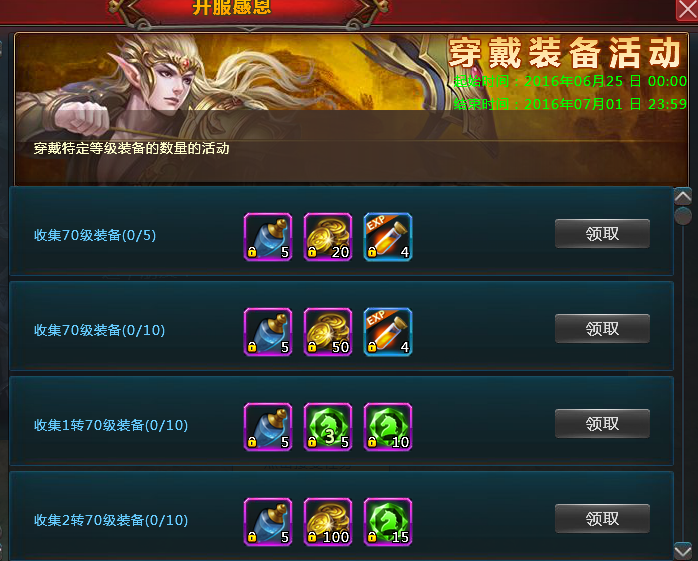 开服前七天,穿戴装备达到要求即可领取对应的穿戴装备奖励哦!
