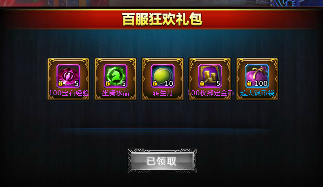 100金币:金钻*2 转生丹*20 坐骑水晶*10 宠物经验丹*5 转生殿卷轴*2 200绑金