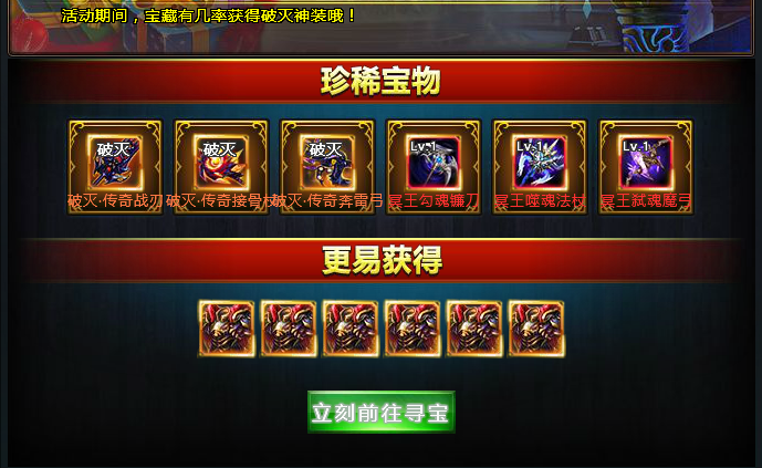 活动期间,通过抽取宝藏,有一定的几率抽取到破灭套装以及冥王武饰,酷炫外观,强悍属性增幅。