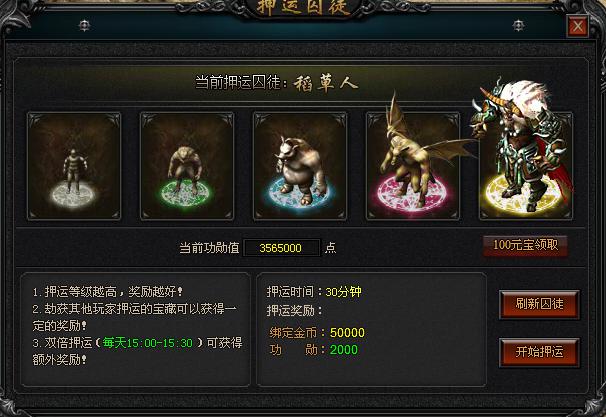 押送囚徒任务:玩家可在土城NPC“押镖”处进行领取囚车,押送囚徒达到目的地后即可领取功勋和金币奖励,功勋值可用来提升功勋境界等级,提升角色属性哦!赶紧来押送囚徒吧!囚徒品质越高,奖励越丰厚,囚徒品质可进行使用刷新符进行刷新!