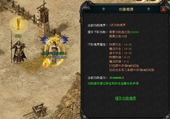提升功勋境界可在土城NPC“押镖”处进行提升,提升功勋境界需要足够的功勋值和对应角色等级,功勋值可通过探宝和押送囚徒任务获得,探宝1次可获得3000点功勋值,押送囚徒等级的品质越高,可获得的的功勋值也越高