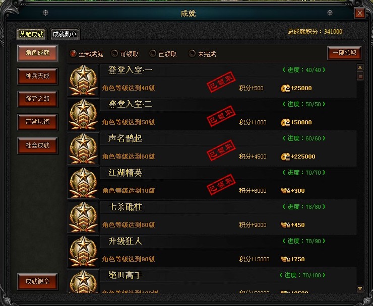 达到各种成就条件后即可领取成就积分和绑定金币奖励