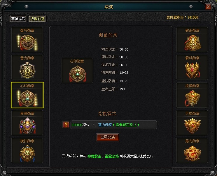 成就积分有什么用途呢,成就积分可用来在成就勋章界面进行兑换成就勋章,勋章等级越高,附加属性也越高,成就勋章一共有10个,第一个成就勋章可直接兑换获得,第二个以后的成就勋章需要前一级的勋章加达到一定成就积分值兑换获得,成就勋章界面: