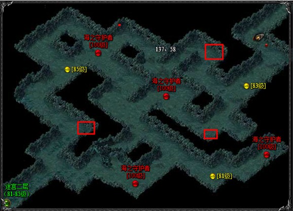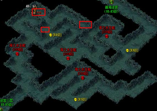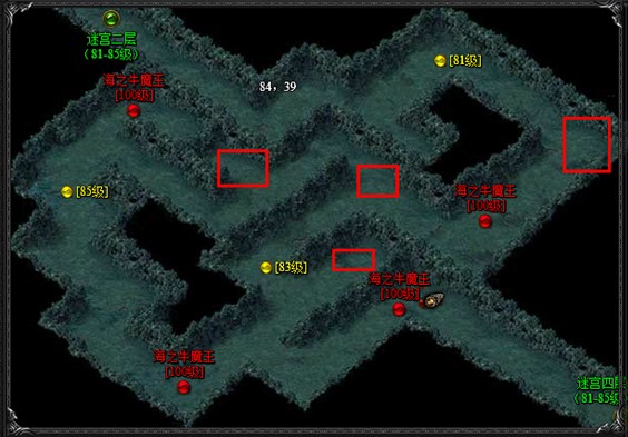 如上三张图为镇海迷宫的三层,这三层是野外挂机的风水宝地,刷怪速度快而且怪物多,而每层都会有几个小BOSS,经验可高达5W一个,但是野外挂机风险很大,特别是是每天双倍时间16:00—17:00,双倍刷怪时间必定会引来玩家的注意。所以小编建议玩家在野外地图挂机刷怪,必须调好回城保护,以防给杀爆装备。