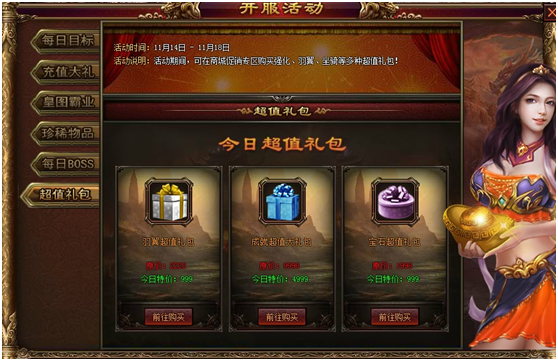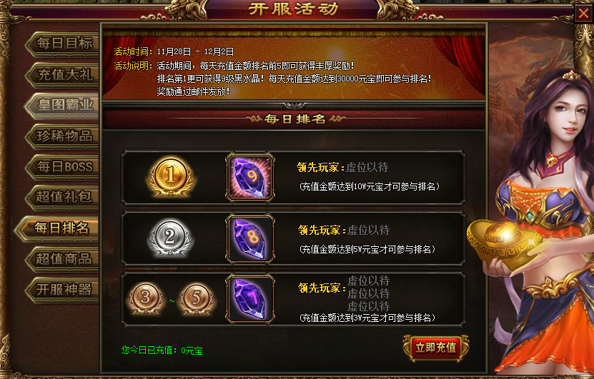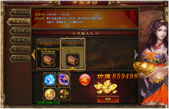活动内容:每日充值1000、3000、6000、10000,皆可获取豪华礼包!