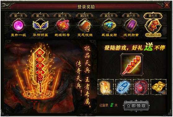 七杀累计7天登陆,每天均可领取丰厚的道具奖励,助力玩家迅速提高实力,登陆天数越高,每日奖励越丰厚,更有称号、新技能、天兵等你拿!!!