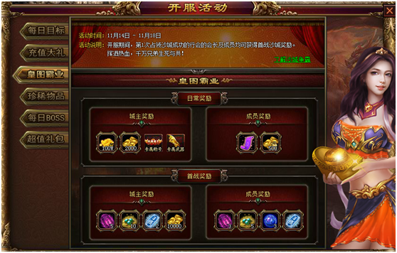 活动内容:开服期间,第一次占领沙城成功的行会的会长及成员均可获得首战沙城奖励。