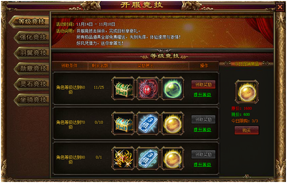 活动内容:活动期间,可在商城促销专区购买强化、羽翼、坐骑等多种礼包!
