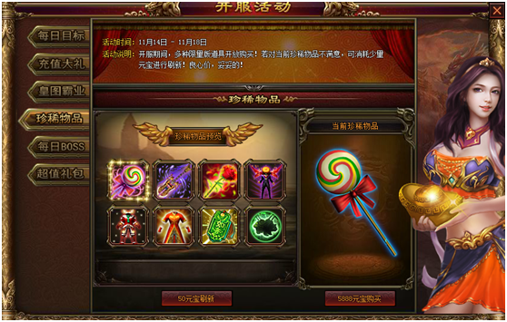 活动内容:开服期间,多种限量本道具开放购买!若对当前珍稀物品不满意,可消耗少量元宝进行刷新!良心价,妥妥的!