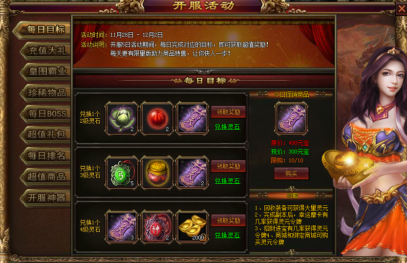 活动内容:开服5日活动期间,每日完成对应的目标,即可获取超值奖励!