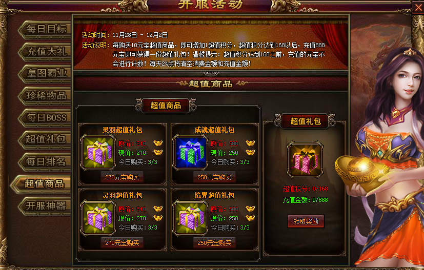 活动时间:开服前5天 活动内容:每购买10元宝超值商品,即可增加1超值积分,超值积分达到168以后,充值888元宝即可获得一份超值礼包!温馨提示:超值积分达到168之前,充值的元宝不会进行计数!每天24点将清空消费金额和充值金额。