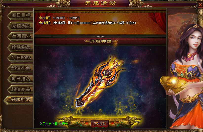 活动时间:开服前5天 活动时间:活动期间,累计充值1000000元宝即可免费领取1个神器-轩辕剑!