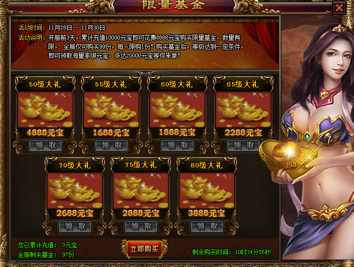 活动说明: 开服前3天,累计充值10000元宝即可花费8888元宝购买限量基金,数量有限,全服仅可购买99份,每人限购1份!购买基金后,等级达到一定条件,即可领取海量非绑定元宝,多达20000元宝等你来拿!