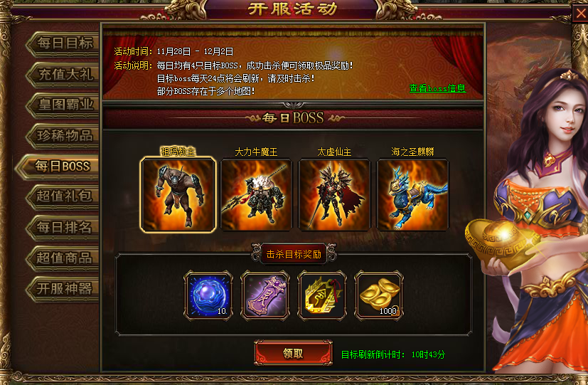 活动内容:每日均有4只目标BOSS,成功击杀便可领取极品奖励!